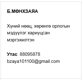 © 2023 ЗОХИОГЧИЙН ЭРХ ХУУЛИАР ХАМГААЛАГДСАН. САЙТЫН БҮХ ЭРХИЙГ БАЯНЗҮРХ ДҮҮРЭГ ЭЗЭМШИНЭ.